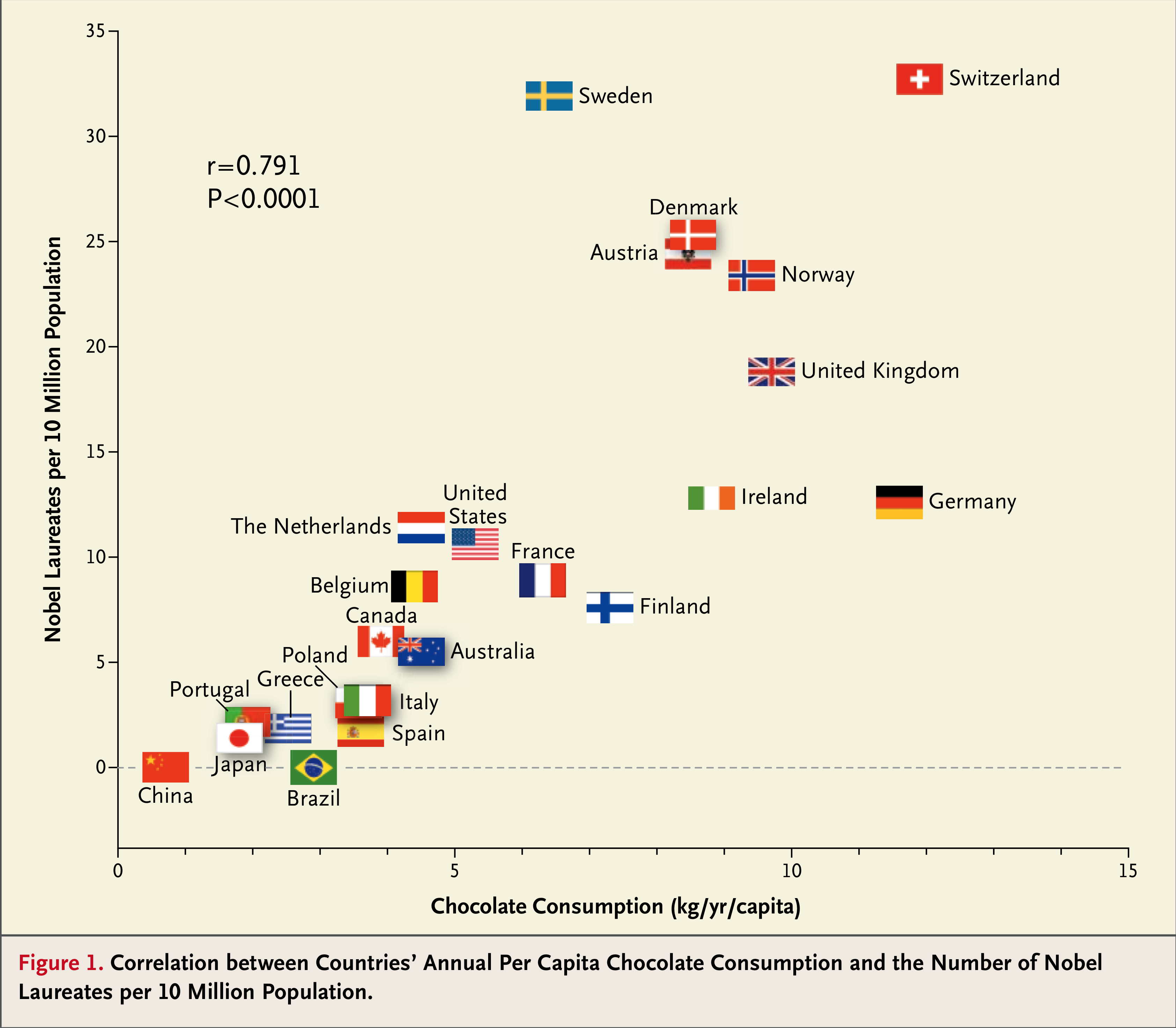 Ref: "Chocolate Consumption, Cognitive Function, and Nobel Laureates" F. H. Messerli, N Engl J Med 2012; 367:1562-1564, Oct 18, 2012, DOI: 10.1056/NEJMon1211064